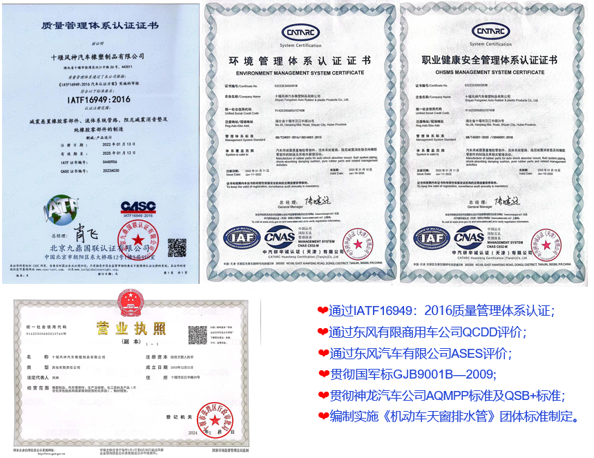 公司秉承【顾客至上‖服务至诚‖质量至真】的经营 理念,建立健全了各项体系认证,先后通过了东风汽 车公司二方质量认证供应商质量评价,2003年8月通 过ISO9001;2000质量体系认证;2005年5月通过德国 莱茵公司ISO/TS16949;2002质量体系认证;2006年通 过东风有限商用车公司QCDD评价,2007年通过东风日 产SES联合供应商质量评价,2008年通过TS16949年度 监督审核,在市场上享有良好声誉,连续十六年被 授予十堰市守合同重信用企业、五星级守合同重信用 企业、企业诚信建设突出贡献单位;连续六年被授予 湖北省守合同重信用企业、湖北省级诚信纳税人;连 续八年被东风汽车公司授予最佳供应商,被多家主机 厂授予供应商和配套产品。